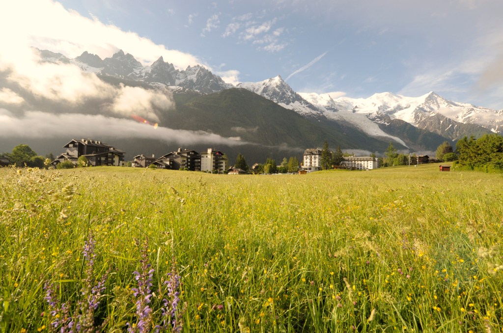The weather during the week has been changeable with lots of cloud cover. Yesterday dawned bright and clear and the view of the mountains from the balcony across the meadow between the residence and Chamonix was stunning. I took the image shown from the meadow with my Nikon D700 and a 12-24mm lens.