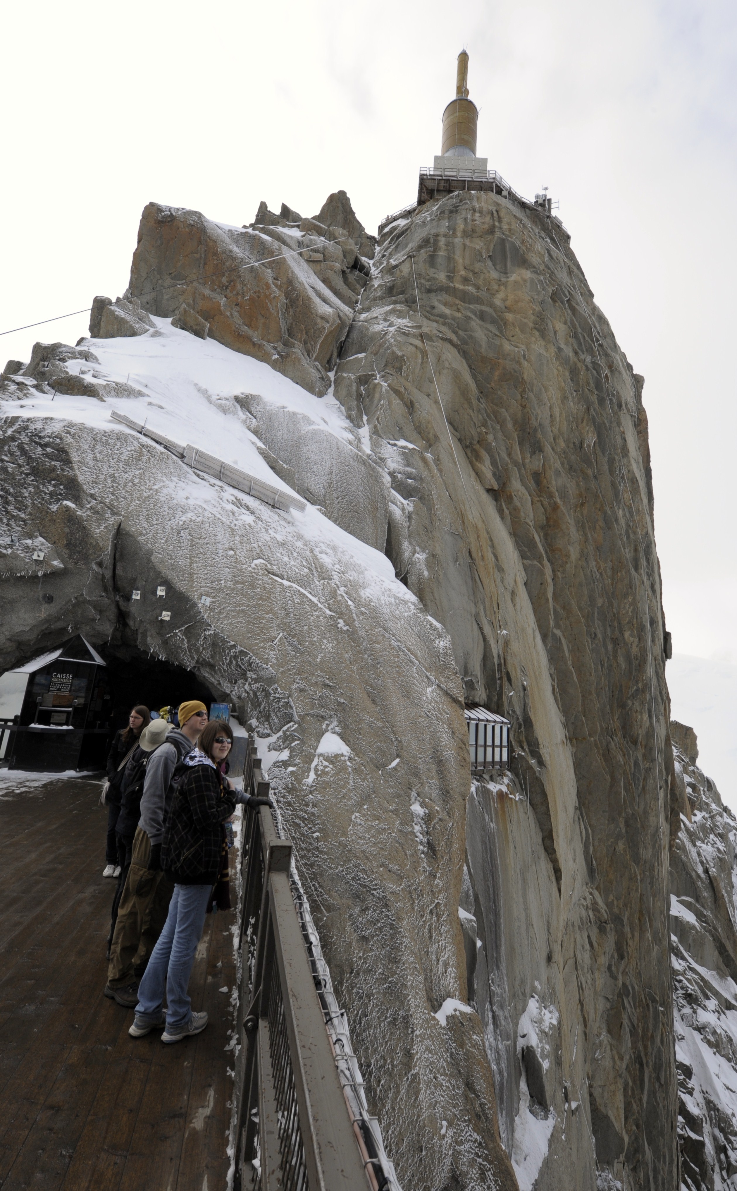 The weather was good enough to venture up to the Aiguille du Midi with the cable car, which operates in two segments from Chamonix. First, you ascend from 1,039m over the forests to the Plan du Aiguille at 2,317m and then take a second car to the terminus at 3,842m on the Aiguille du Midi (the actual terminus is at 3,776m and there’s a separate elevator to the top. The second segment is by far the most spectacular as the car travels at up to 12.5 m/second over sheer snow-covered rocks up to the top. Once there, you marvel at the engineering required to build the various facilities (telecoms, restaurant, viewing balconies, exit point for skiers and alpine climbers to the Vallee Blanche, and another cable car over to Italy). Truly it’s worth the Euro41 fare to travel to the top.