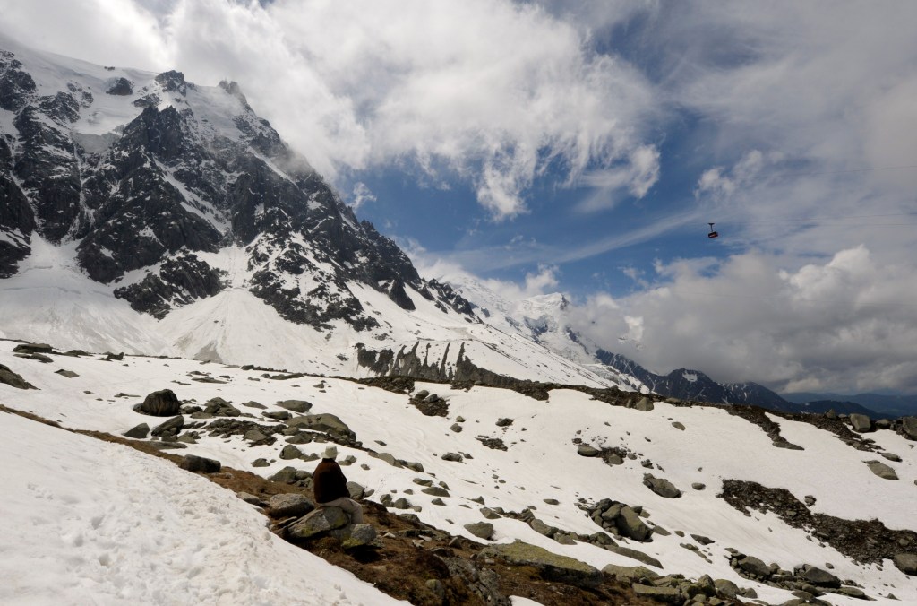 On the way down, we stopped at Plan du Aiguille for a drink at the cafe there and then took the opportunity to walk towards the mountain to get a better view of how the cable car ascends to the Aiguille. There was a fair amount of slushy snow on the ground but the amount was surprising given that it was mid June. Certainly, there was more snow around than I remember during our last visit to Chamonix in July 1998. Anyway, the snow didn’t pose any great difficulties and we enjoyed the walk.