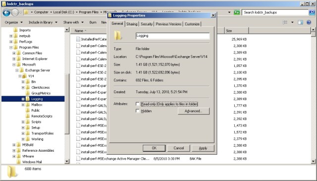 The biggest culprit is the Exchange Server\V14\Logging\lodctr_backups folder. As you can see from the screen shot, this folder held 1.41 GB of data, all of which is utterly unnecessary to run Exchange 2010 (any version). Another of my Exchange 2010 servers had 3.52GB in this folder. Given the amount of storage available to servers these days, we really have become very blasé about wasting a gigabyte or two. In the early days of Exchange, the hard disks that we installed into servers might only have been 5 or 10 GB or so… but that’s another story