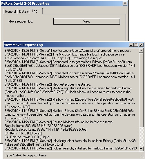As you can see from this discussion, the detailed move history is sufficiently detailed to provide a real insight into the workings of Exchange 2010 move requests. One more small detail – the Exchange 2010 SP1 version of EMC allows you to view a move log as a move request progresses. Click on Move Requests in the Mailbox node and then select a mailbox that is being moved, then click on Properties and then the Log tab. The information presented here (see example below) is very similar to the detailed move report – the sole difference is that it doesn’t come from the user’s mailbox unless the move is complete. When a move is in progress, Exchange keeps the move report data in the system mailbox of the target database unless the move operates in push mode, in which case the data is kept in the system mailbox of the source database. When the move completes, MRS moves the data from the system mailbox into the user’s mailbox.