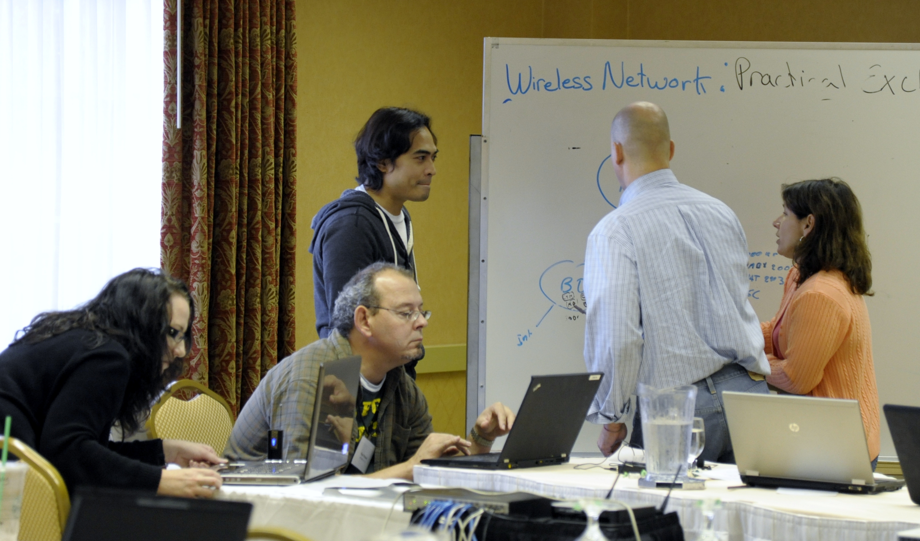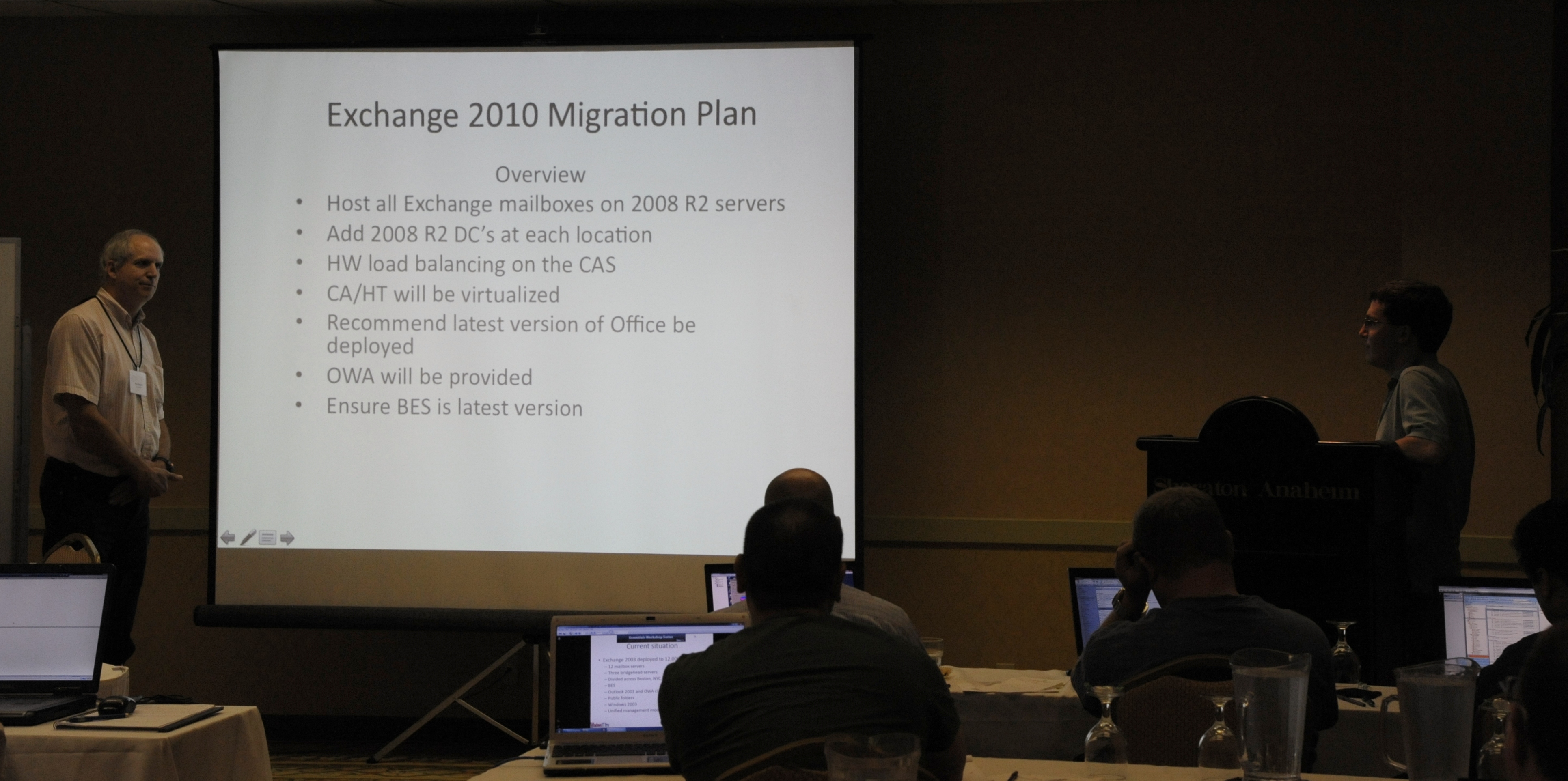 The design workshops were the big success of the seminar. We gave attendees a prototype Exchange 2003 organization and asked them to take the role of consultants coming in to advise the CIO of the company as to how best to deploy Exchange 2010. They had an hour to put the information that we had provided during the seminar into practice and generate a high-level deployment approach in the form of a PowerPoint deck (classic consultant 101 material). They then submitted their findings to Paul, who selected a couple of plans that we then had the teams present to the CIO. Paul alleges that I was able to snap into character of a grumpy, impatient, and rude CIO all too readily, but I think I simply performed to specification. This time round we had Brian act as the Chief Architect of the customer so that he could ask some pointed technical questions of the teams. All in all, a valuable learning exercise that reinforced the theory presented in a very practical sense.