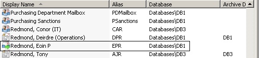 The first time when an administrator is likely to realize that move requests are retained and not cleaned out is when they attempt to move a mailbox that was previously moved by MRS. At this point, they’ll be told that a move request already exists for the mailbox and they will have to clear the move request before they are able to proceed. The Exchange Management Console (EMC) attempts to bring the fact that a mailbox has a move request registered to the attention of administrators by displaying a different icon for the mailbox, but as you can see below, it’s all too easy to miss this subtlety.