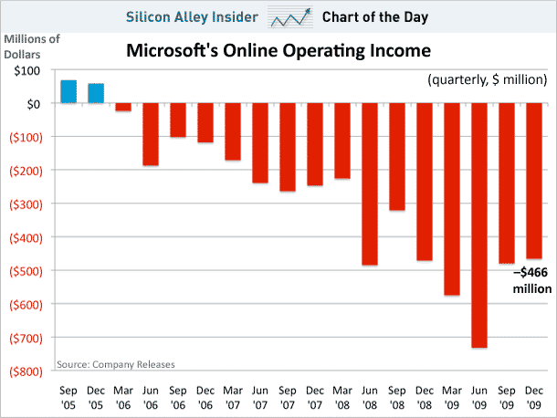 However, while Microsoft was reporting some success in terms of customer take-up, the financial side didn’t seem to be so pretty with some commentators such as Scott Berkun questioning the vast deficits that Microsoft has accrued in its Online Division (see the chart below). Some investment to build out the datacenters required to support cloud services is inevitable; the problem seems to be that the income from customers isn’t yet getting near to matching the expense line. We shall see how this story develops over the coming years.
