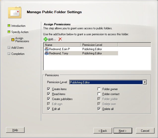 The Public Folder Settings Wizard provided in Exchange 2010 SP1 (Figure 1) makes the process even easier. You can opt to set permissions on a single public folder or on a folder and all its children. In addition, you can assign permissions to multiple users at one time and select a different set of permissions to assign to each user.