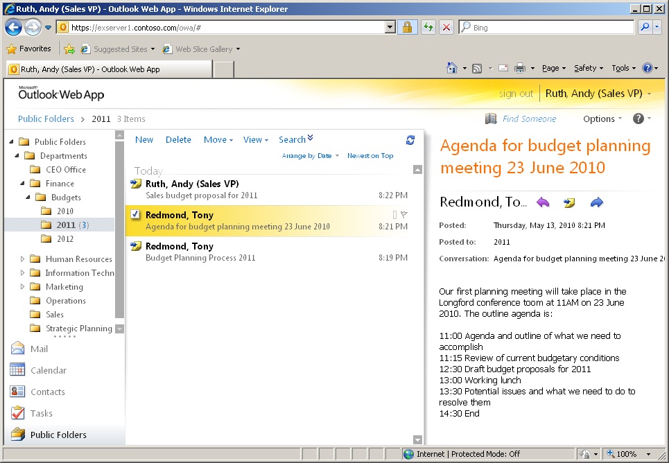 MAPI clients like Outlook have been able to access public folders since the earliest version of Exchange and remain the most functional client in that you can set permissions for a folder, view the storage used for a folder, and so on. OWA has had a somewhat erratic history with public folders with missing features or even support for public folders completely non-existent, as happened in the RTM version of Exchange 2007. Public folders are supported by OWA 2010 and present much the same attractive interface as mailbox folders do (Figure 3). It’s important to understand that before OWA 2010 can connect to a public folder, a replica of that folder must exist on an Exchange 2010 mailbox server. OWA 2010 is not able to access public folders on Exchange 2003 or 2007 servers.