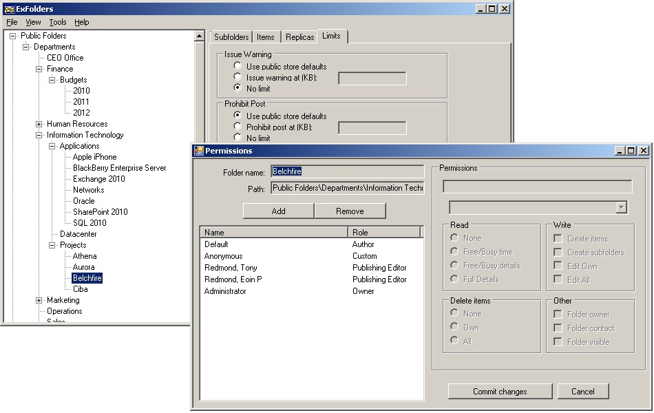 While you can cheerfully amend client permissions on a public folder, matters often are not straightforward because public folders operate in a hierarchy where child folders inherit the permissions of their parent. You might amend the permission on one folder and omit to make the same change on another and expose information to unwanted access. The code to amend client permissions on a folder and be sure that all of the permissions are respected by child folders is complicated. For this reason, Microsoft provides two scripts with Exchange to allow you to replace a user with another user for a folder and to replace a user’s permission with another set of permissions on a folder. Both scripts perform recursive updates to ensure that the same changes are applied to child folders. The scripts are: