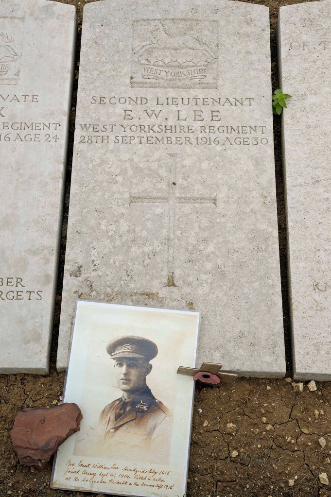 I found the gravestone of 2nd Lieutenant E.W. Lee of the West Yorkshire Regiment, killed on 28 Sept 1916. The relatives of Lieutenant Lee had placed a nice photo of him at the base of the tombstone and wedged it down with a rock and a poppy cross. Lieutenant Lee was killed during one of the many assaults that the British launched on Thiepval and its surrounding fortifications after July 1. Although the 36th Division made an amazing attack on July 1 to seize much of the German front and second lines, including capturing the Schwaben Redoubt, reinforcements could not get to them due to the criss-cross of machine gun fire from all sides and the British did not capture the Schwaben Redoubt finally until 14 October 1916 when a combined attack by the 18th and 39th Divisions succeeded.