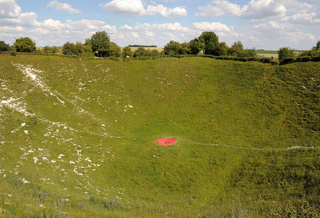 My last stop was at the Lochnagar crater near the village of La Boisselle, just off the main Albert-Bapaume road. The crater is the result of exploding a mine of some 60,000 pounds of ammonal in an attempt to demolish part of the German front line and create a natural fortress for the advancing British troops to defend. The crater is over 300 feet across and about 90 feet deep and is dangerous because of the erosion of the sides of the crater. Two mines were detonated near La Boisselle but neither had the desired effect and the British only captured a small part of the village on July 1.