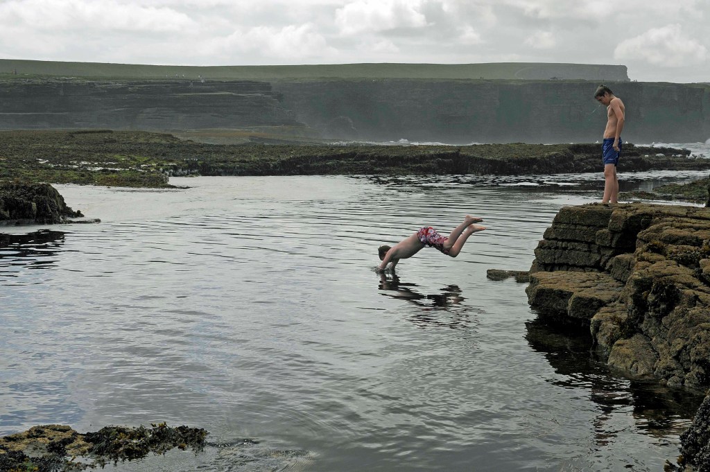 En route to the cliff walk, you pass the Diamond Rocks. These form a reef that protects the entrance to Moore Bay and are exposed at low tide, at which time they become a pleasure ground for people who want to swim in the many natural deep pools revealed by the ebbing tide, search for sea creatures or gather molluscs from the rocks, or simply take the opportunity to walk out and admire an unusual and beautiful view of Kilkee and its surrounds.