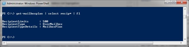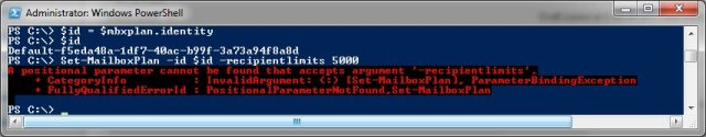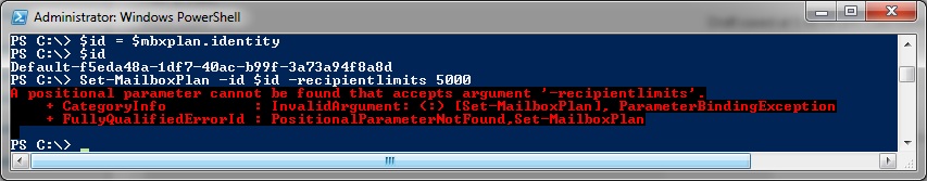 The reason of course is that Exchange’s Role Based Access Control (RBAC) security model filters the available parameters for Set-MailboxPlan so that tenant administrators don’t see RecipientLimits as a valid option (RBAC allows you to define roles to the granular level of suppressing individual parameters for a command). If you attempt to set a value, PowerShell returns an error.