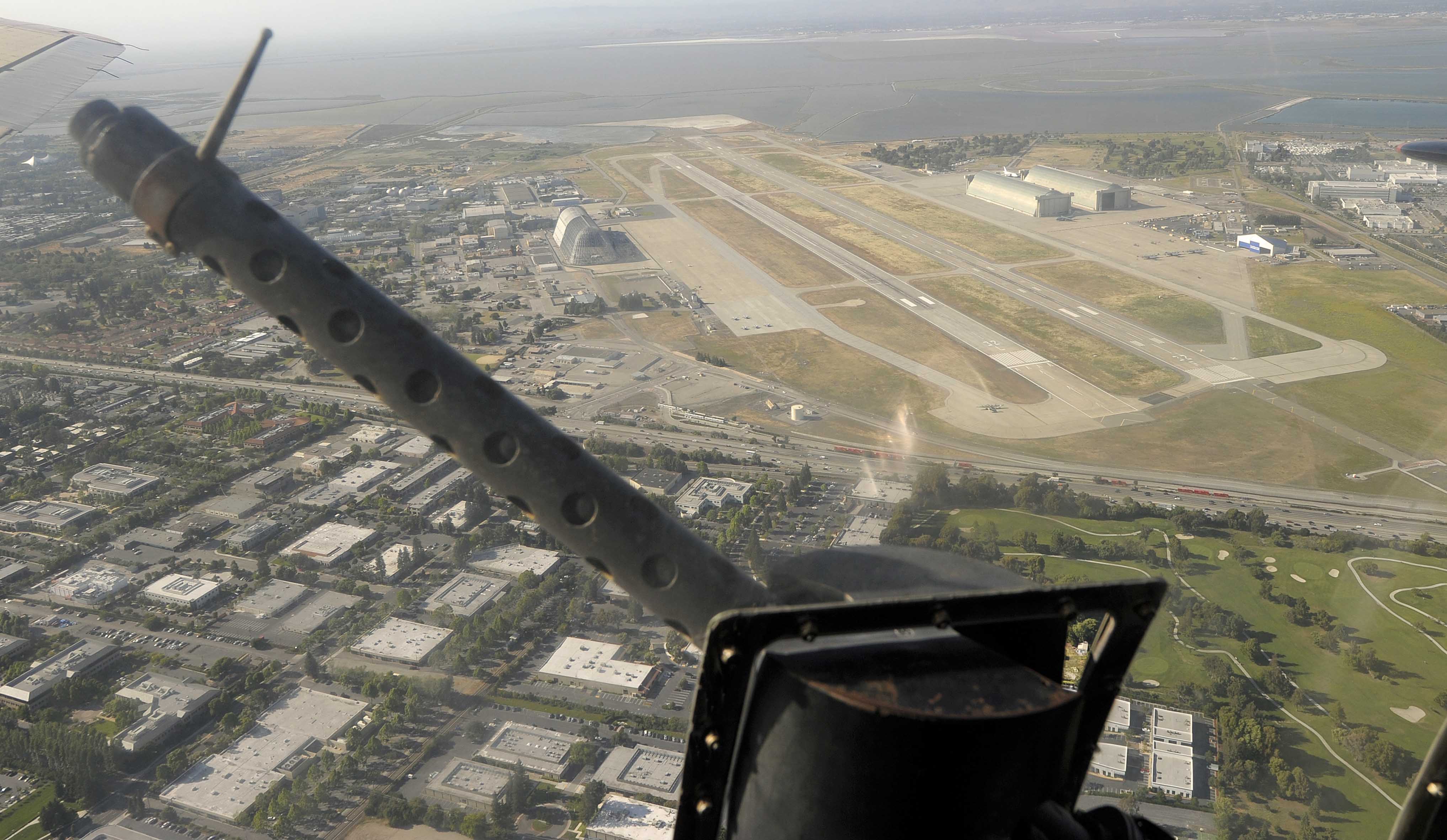 The view from the B-17 as it climbed over Moffett was amazing with the runways, hangers, and other aircraft clearly visible. The enjoyment continued as the B-17 flew towards Palo Alto and the foothills behind Stanford. I took the chance to stand at the observation hatch and enjoyed having the airflow rearrange my carefully groomed hair.
