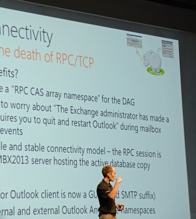 But despite his choice of words, Ross is usually good value when he speaks, especially when trashing some of the parts of Exchange that he cares little for, such as RPC/TCP and the death of Greg Taylor’s “backside of the elephant” analogy (the famous picture used by Greg in his CAS sessions is capture in the top right-hand corner of the slide shown below).