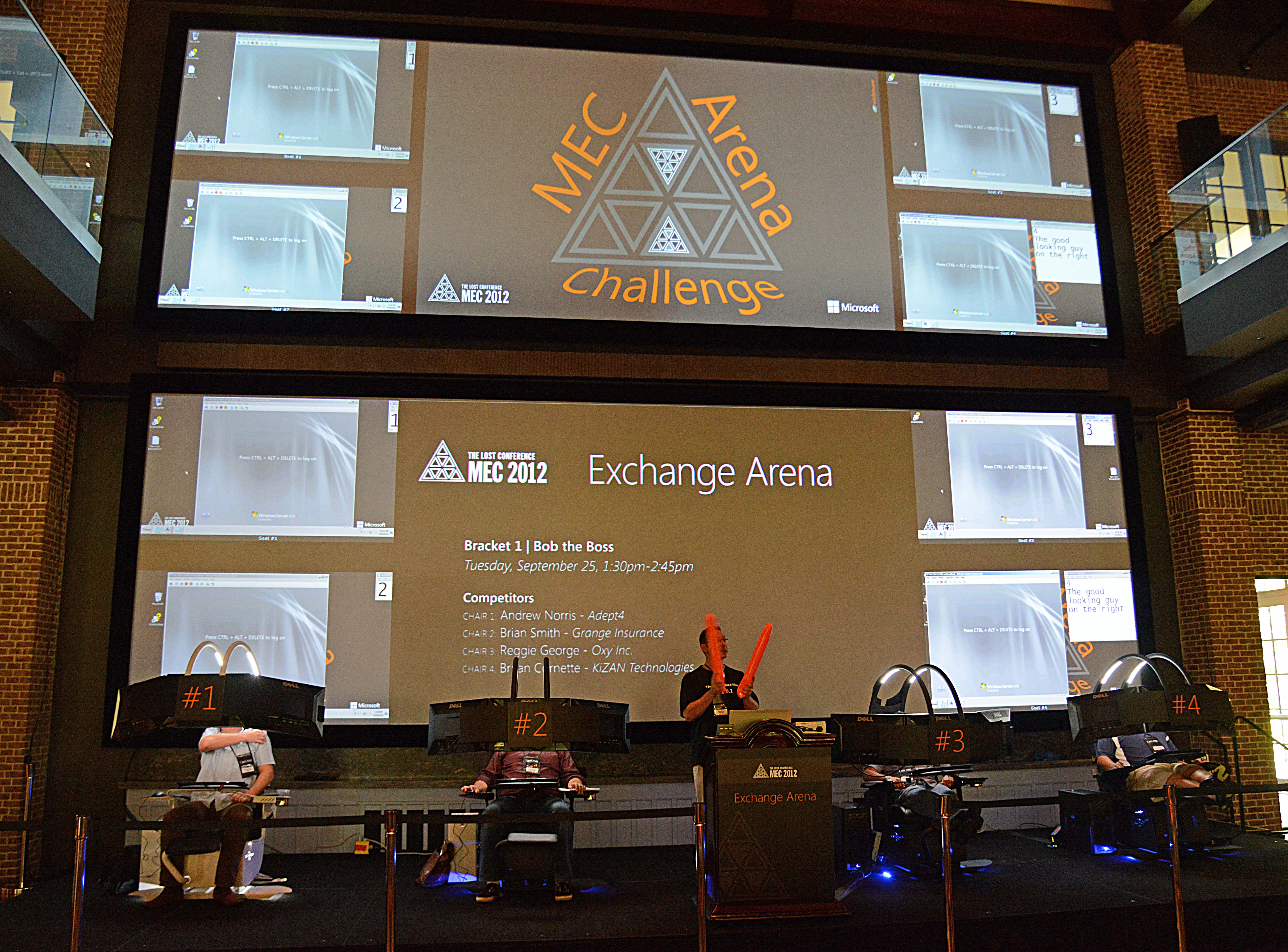 The Exchange Arena was located in a bar featuring a wall of TVs. This proved to be highly entertaining for the audience (note to organizers: let’s have larger text on the screens to help vision-challenged people like me) as well as providing an opportunity for people to win an Emperor Scorpion chair (the chair that the competitors are sitting in the photo above), which I understand to be highly desirable to those who shop for a chair in which to game themselves into oblivion. The challenges (in the case of the first challenge, to figure out why Exchange wasn’t sending a manager’s email) set to the competitors apparently come from the Exchange MCM exam so they’re pretty tough  and definitely not the kind of thing you’d solve in a heartbeat. Congratulations to Bryan Cornette and Martina Miskovic, who won today’s heats and progress into the final. Also kudos to MC Nicolas Blank, who cut a rather compelling figure in the middle. Of course, the contestants were handicapped by having to follow his directions in a broad South African accent, but that’s all part of the competition!