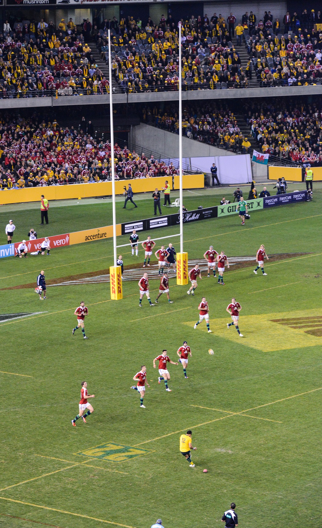 Because we’re part of a tour group that provide match tickets we weren’t aware of the ticket cost for the first test. This time round the price was printed on the ticket and we were amazed to find that Ticketmaster had charged AUD$240.21 (about EUR185) for a “Gold” level ticket on Tier 3 of the Etihad Stadium. In practical terms this means that we were between the 22m and half-way line in the third tier, about 50m away from the pitch. Unlike the SunCorp Stadium in Brisbane or all Six Nations grounds, the Etihad curves to accommodate Australian Rules, so you end up quite a bit away from the action. Paying such a large amount for what really wasn’t a great seat came as a bit of a shock. I certainly won’t complain too much when the IRFU ask for EUR100 for much better seats in Lansdowne Road for a Six Nations match or a game against New Zealand or another headline nation. It seems like the Australian Rugby Union has taken every opportunity to extract money from fans on the Lions tour.