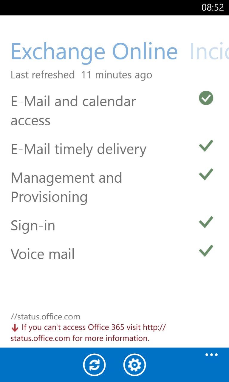 The app itself is pretty simple. I doubt that I will need to be told when Exchange Online is not working properly because a problem with something like email delivery is noticed pretty quickly. However, functions such as provisioning are not as visible and issues in applications like SharePoint Online might not be important to you as they are to end users who depend on a document library. It’s good to be able to get a status update at a glance, which is what this app delivers.