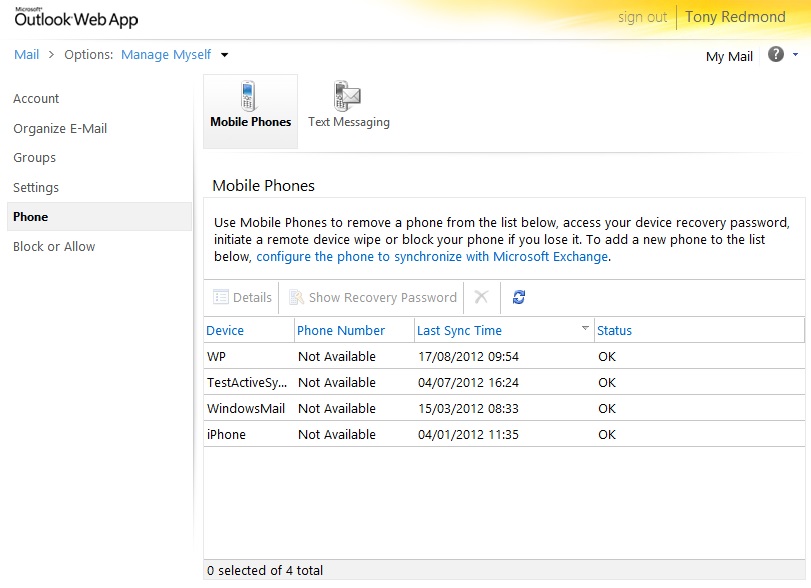 Figure 1: Listing ActiveSync partnerships from Outlook Web App (Exchange 2010)