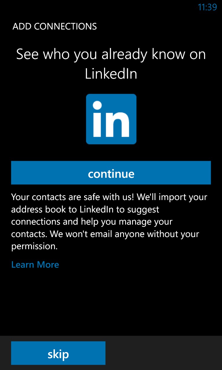 To be fair to LinkedIn, I removed the app from my phone and then reinstalled it from the Windows Store to see what warnings are displayed.