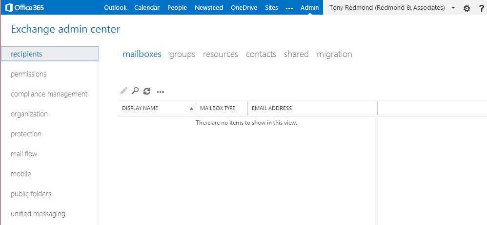 All seemed well, except that an even more puzzling problem now appeared. I reported to Microsoft that I could no longer see any mailboxes through EAC. On May 21, I noticed that a public folder mailbox that had been set up under Plan P1 was missing. However, just like running Get-Mailbox in EMS to see mailboxes, I was able to run Get-PublicFolder and Get-Mailbox -PublicFolder to list all the public folders and public folder mailboxes.