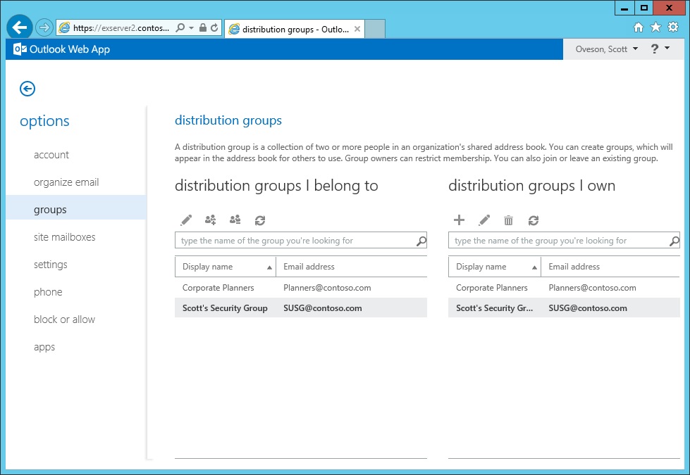 The next step was to log into OWA using one of the user accounts that held the Security Group Creation and Membership role. OWA and EAC share the same “slab-based” user interface, which means that user interface components are only loaded if the user has the permission to interact with an object. For example, if your user does not hold the permission to work with public folders, you won’t see the public folders UI through EAC.