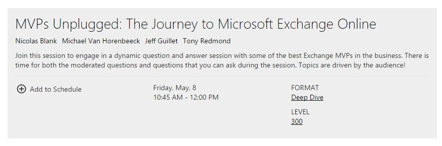 The second session is at 10:45 am on Friday, May 8. There are many downsides in having a session scheduled so late in a conference. First, people are tired after four full days of chasing around a conference center going from session to session. Second, people are even more tired because they will have attended the various parties and other after-hours events that occur at major conferences like Ignite. Third, those who do turn up to panel Q&A sessions like “The Journey to Microsoft Exchange Online” often come equipped with questions that no one else has been able to answer during the rest of the conference, which then leads to some entertaining “ohs” and “ahs” from panel members.