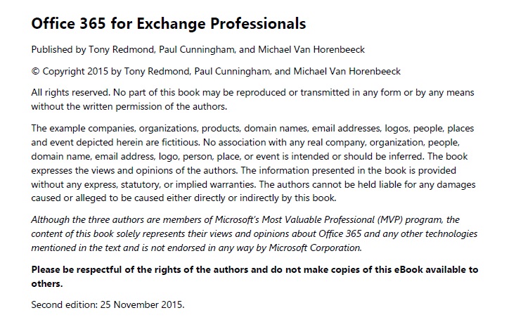 One year after we started to write the book, several thousand people have copies of “Office 365 for Exchange Professionals”. We are delighted at the feedback and positive comments that we have received. However, some questions have arisen as to how often we update the text and what right anyone has to receive an update, so here’s some information about editions and updates in an attempt to clarify the position.
