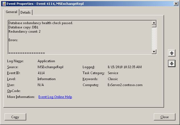 4efa-9ae6-23bb2fb917c8)', database 'DB1', Mailbox server 'EXSERVER1.contoso.com' Ver