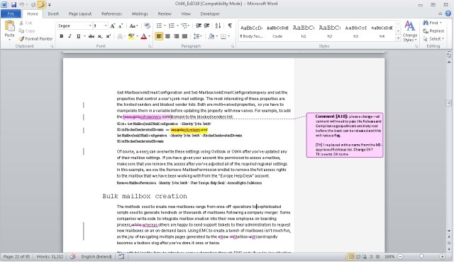 Update: 3 October – Chapter 15 (Compliance). This is a heavyweight chapter because of the range of new compliance features incorporated in Exchange 2010 and enhanced in Exchange 2010 SP1. All 105 pages have now been checked and returned to Microsoft. In addition, I’ve now seen and checked final set pages through chapter 9, so we are really getting close to the point where we can declare success and look forward to final books.